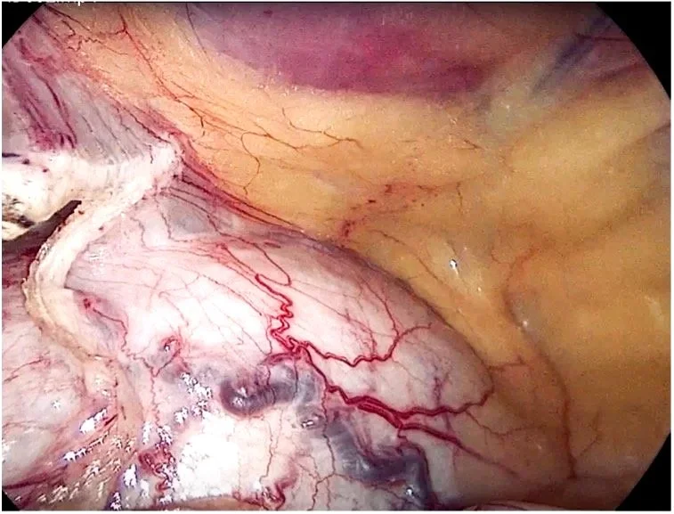 During secondary port site placement, the anterior abdominal wall was inspected, and the inferior epigastric artery and vein identified, with ports placed lateral to these vessels. The skin, muscular and fascial layers were incised with a scalpel, track open with an artery clip and 5mm ports then inserted to the left and right lower quadrants under direct vision.